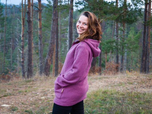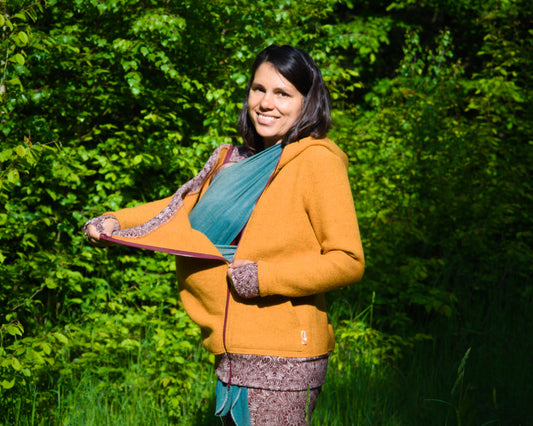 I was searching for some babywearing hoodie, that will keep me and my baby warm even in a bit rough and windy autumn days coming soon. As Merino is perfectly gentle to the skin but in wind and weather comes to its limits, Mariana was so kind to transfer her merino babywearing design to the boiled wool fabric. She was very open to every extra wish I had and added it same time. I am so happy that I found her and was so excited to receive the final product.