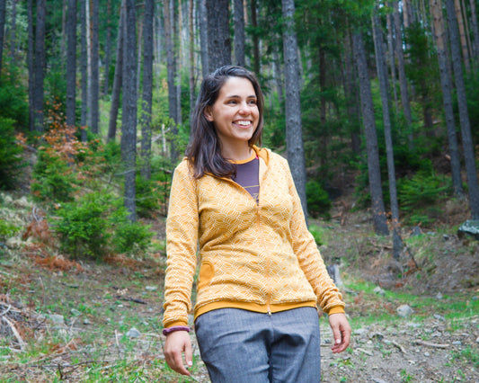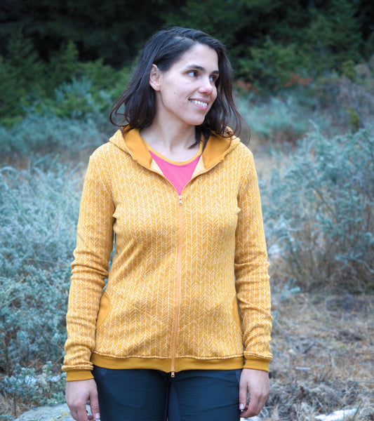 Merinohoodie mit Reissverschluss und Ocker-Muster