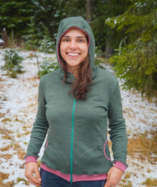 Merinohoodie mit Reissverschluss in moosgrün und thymian