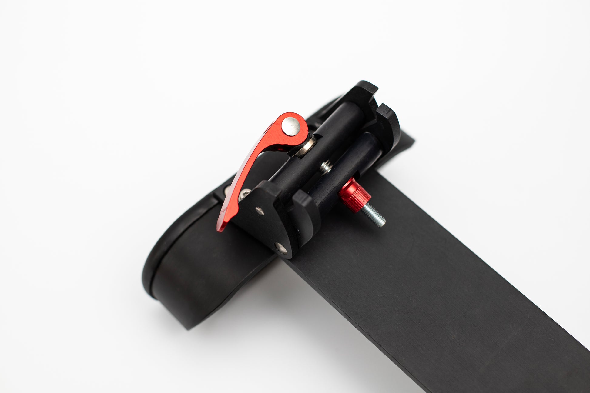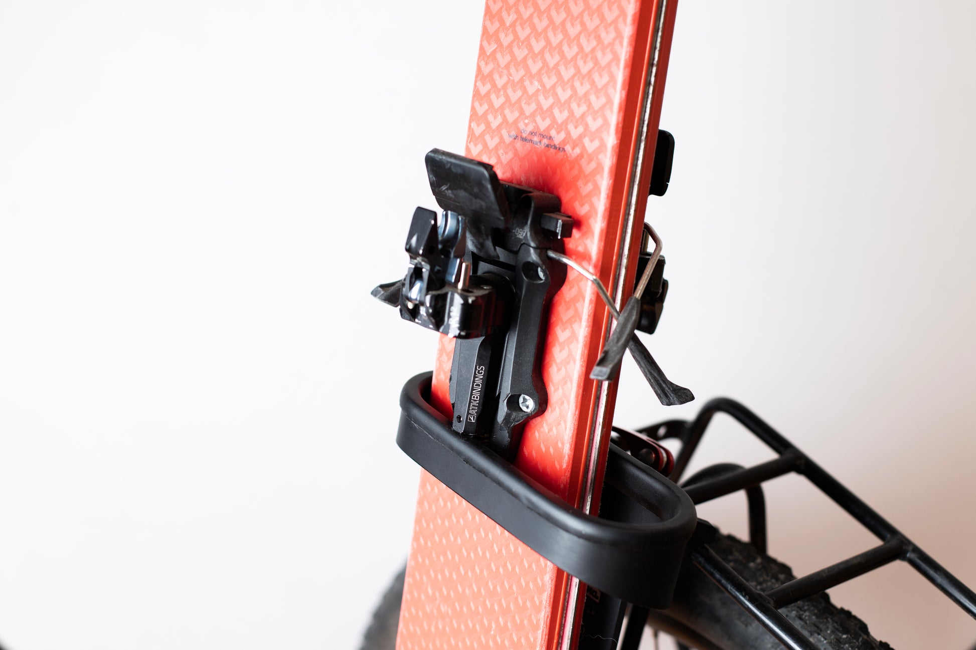 The ski holder is a safe and stable tool for transporting your skis on a bike. The ski holder is fixed to the bike porter over a very easy-to-use 3-point fixation. Once it is fixed, you just place the skis through the two oval aluminum hangers. A spring on the lower hanger will stop the skis from bouncing around, making this a very stable and thus safe way to transport your skis.