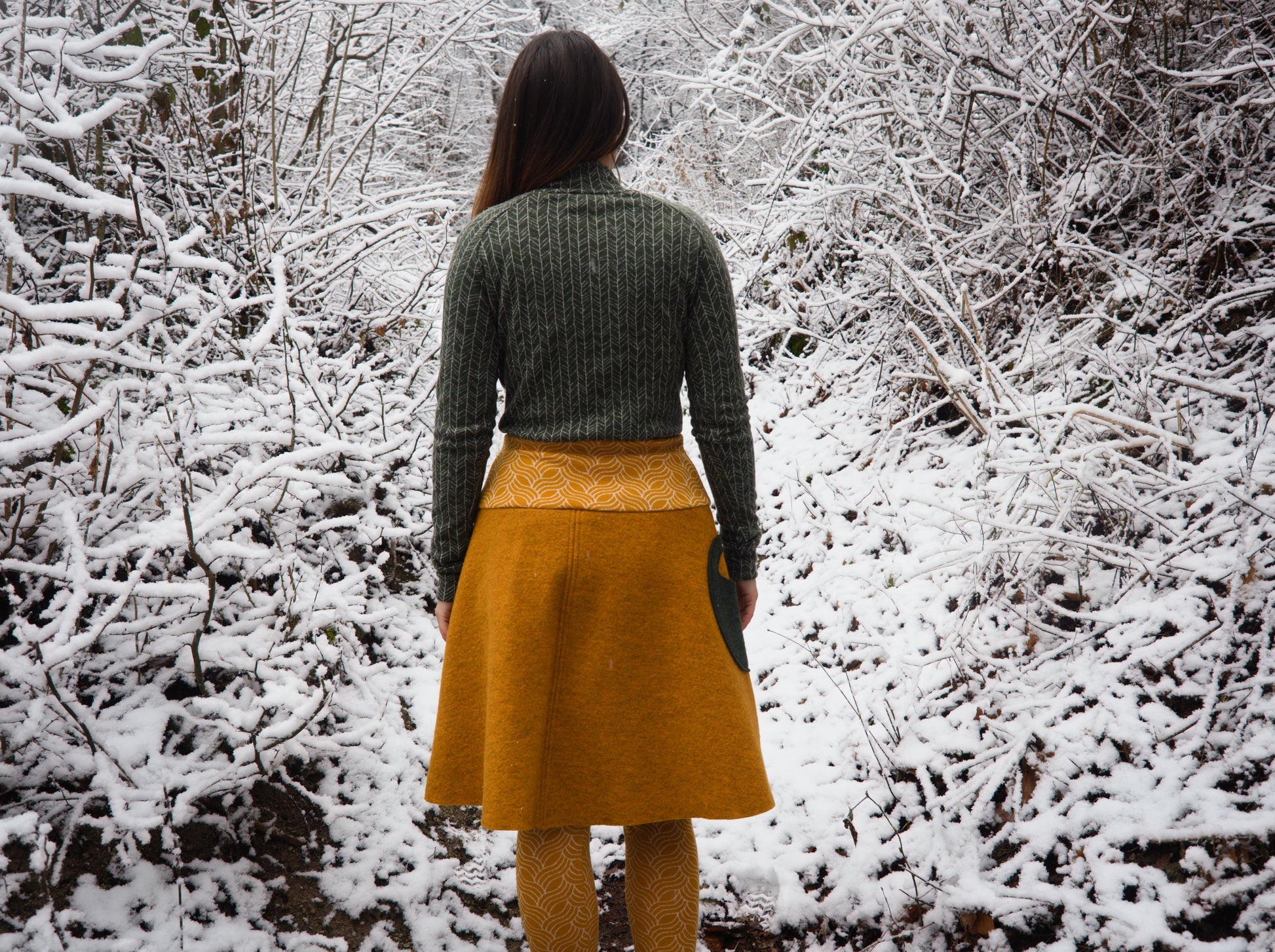 Quality made half-circle skirt from boiled wool with a creative pocket. Made of 100% soft virgin wool walk and 100% merino waistband. The flat double sewing are there for extra strength and durability. Perfect for casual everyday use - in the office or at home in the cold days.